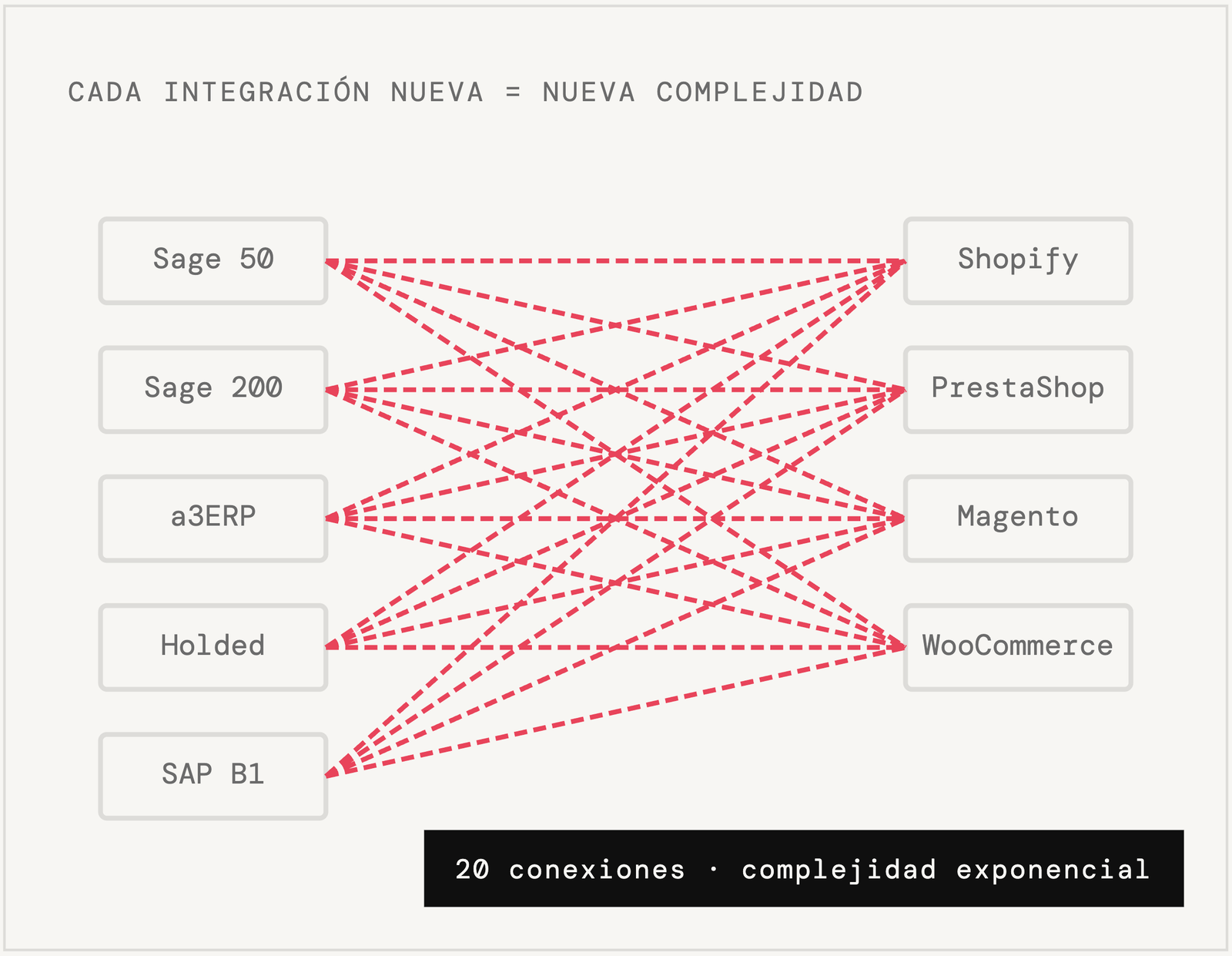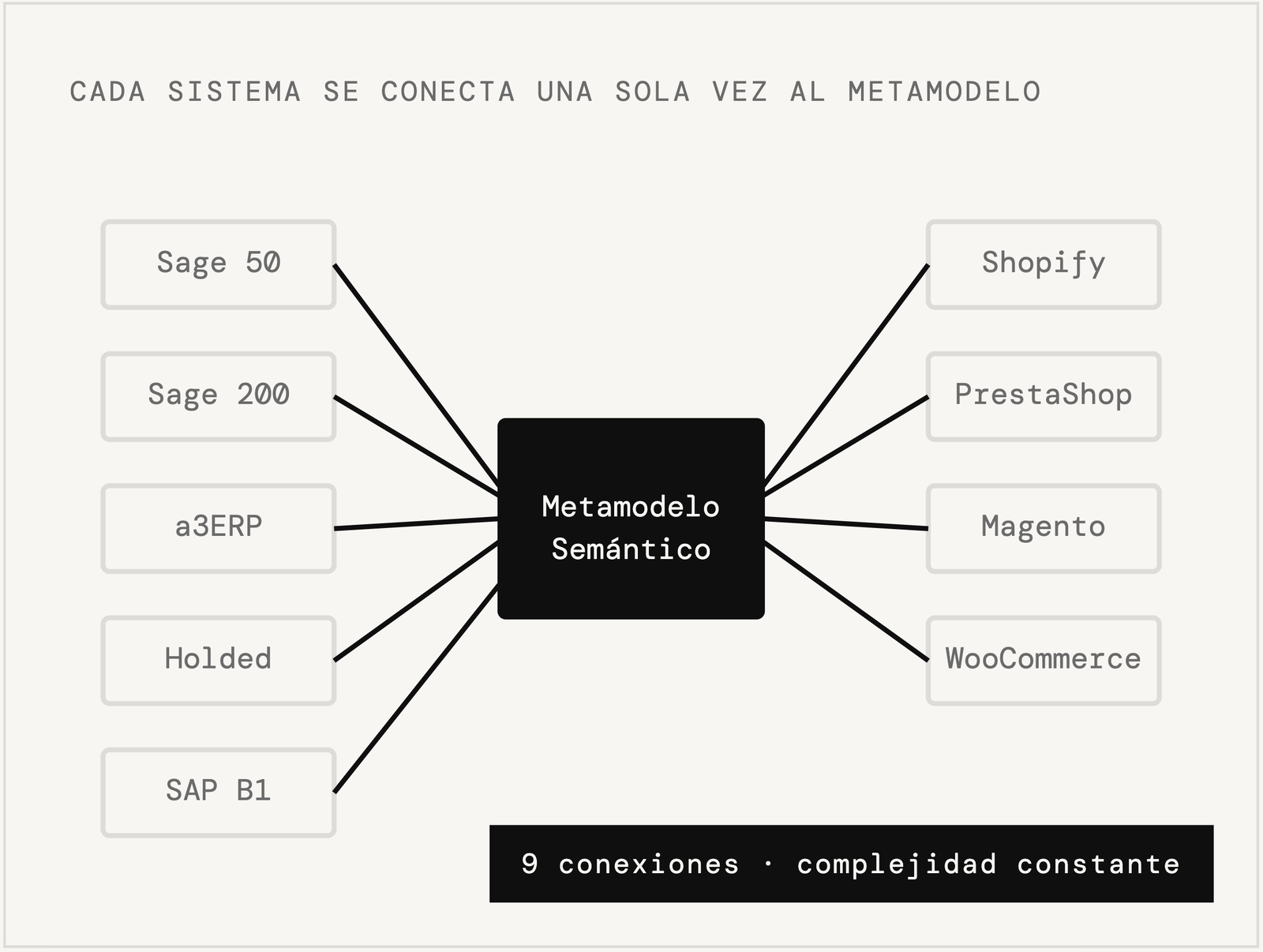 | Añadir un nuevo ERP o plataforma | Nuevo proyecto, nuevo coste | ✓Activación declarativa |